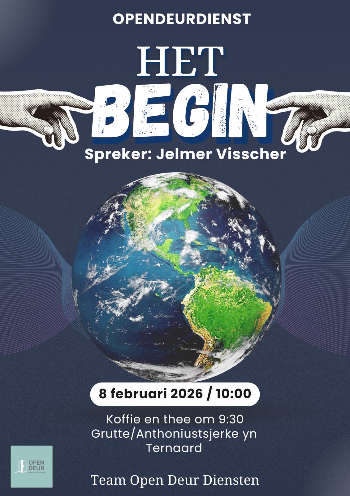 Op 8 februari 2026 organiseert de PKN gemeente Ternaard weer een Open Deur Gezinsdienst. Dit is een dienst voor jong en oud met live muziek. Voor de kinderen is er een activiteit tijdens de dienst. Ook hele jonge kinderen mogen gezellig mee naar de dienst. Het thema is “Het begin” en de spreker is Jelmer Visscher. Centraal staan: ontmoeting met elkaar, delen in geloof, samen muziek maken en zingen. Benieuwd hoe het zit met Genesis, het ontstaan van de aarde, de zondeval? Mis deze dienst dan niet!Locatie: Grutte of Antoniustsjerke, Tsjerkestrjitte 1 te Ternaard