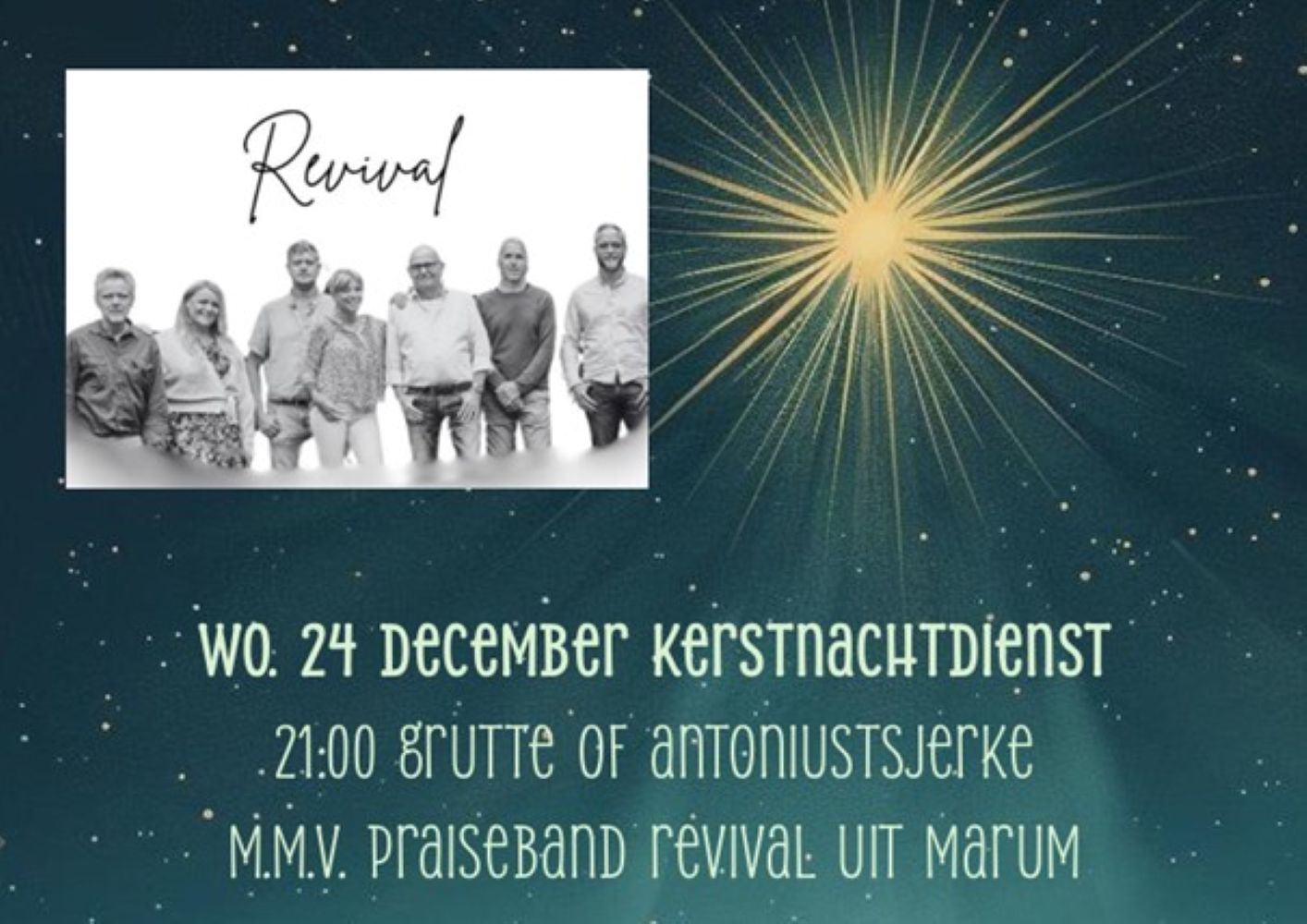 kerstnachtdienst m.m.v. praiseband revival uit Marum woensdag 24 december om 21:00 uur · Grutte of Antoniustsjerke Klik HIER voor Folder.....